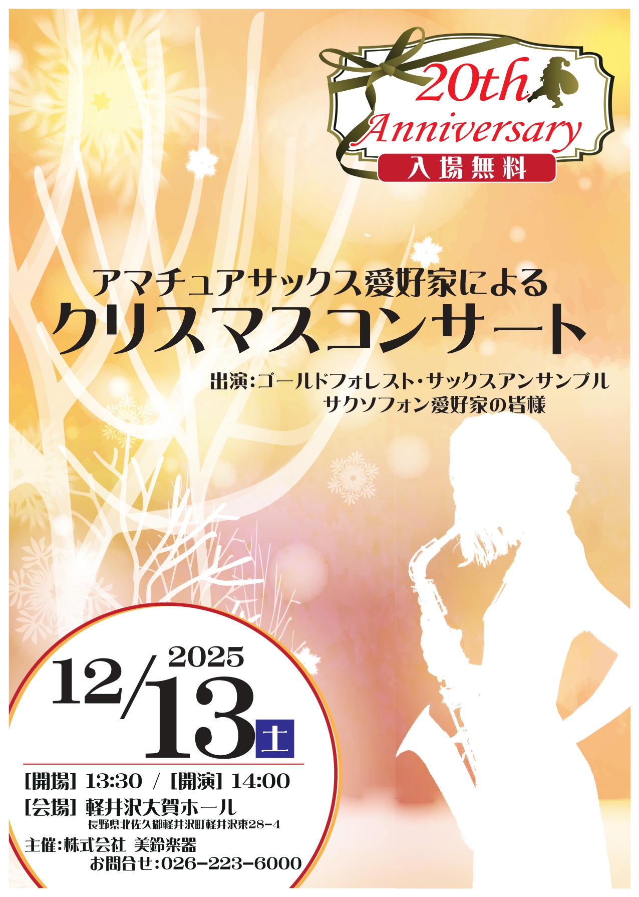 08:00 - 17:00 クラシック クラシック 2025.12.13(土) 開場13:30開演14:00 アマチュアサックス愛好家によるクリスマスコンサート 20th Anniversary クラシック クラシック 2025.12.13(土) 開場13:30開演14:00 アマチュアサックス愛好家によるクリスマスコンサート 20th Anniversary 12月 13日 @ 08:00 - 17:00 アマチュアサックス愛好家によるクリスマスコンサート 20th Anniversary